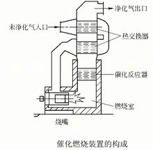 催化燃燒裝置主要由熱交換器、燃燒室、催化反應器、熱回收系統和凈化煙氣的排放煙囪等部分組成,如右圖所示。其凈化原理是:未凈化氣體在進(jìn)入燃燒室以前,先經(jīng)過(guò)熱交換器被預熱后送至燃燒室,在燃燒室內達到所要求的反應溫度,氧化反應在催化反應器中進(jìn)行,凈化后煙氣經(jīng)熱交換器釋放出部分熱量,再由煙囪排入大氣。